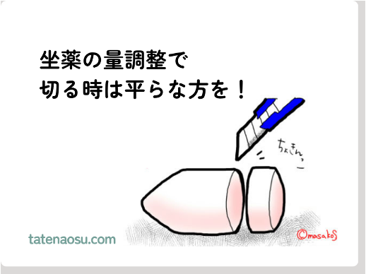 坐薬は尖った方からいれるとスムーズに挿入できるように設計されているので、「切るときは平らなほう」になります。